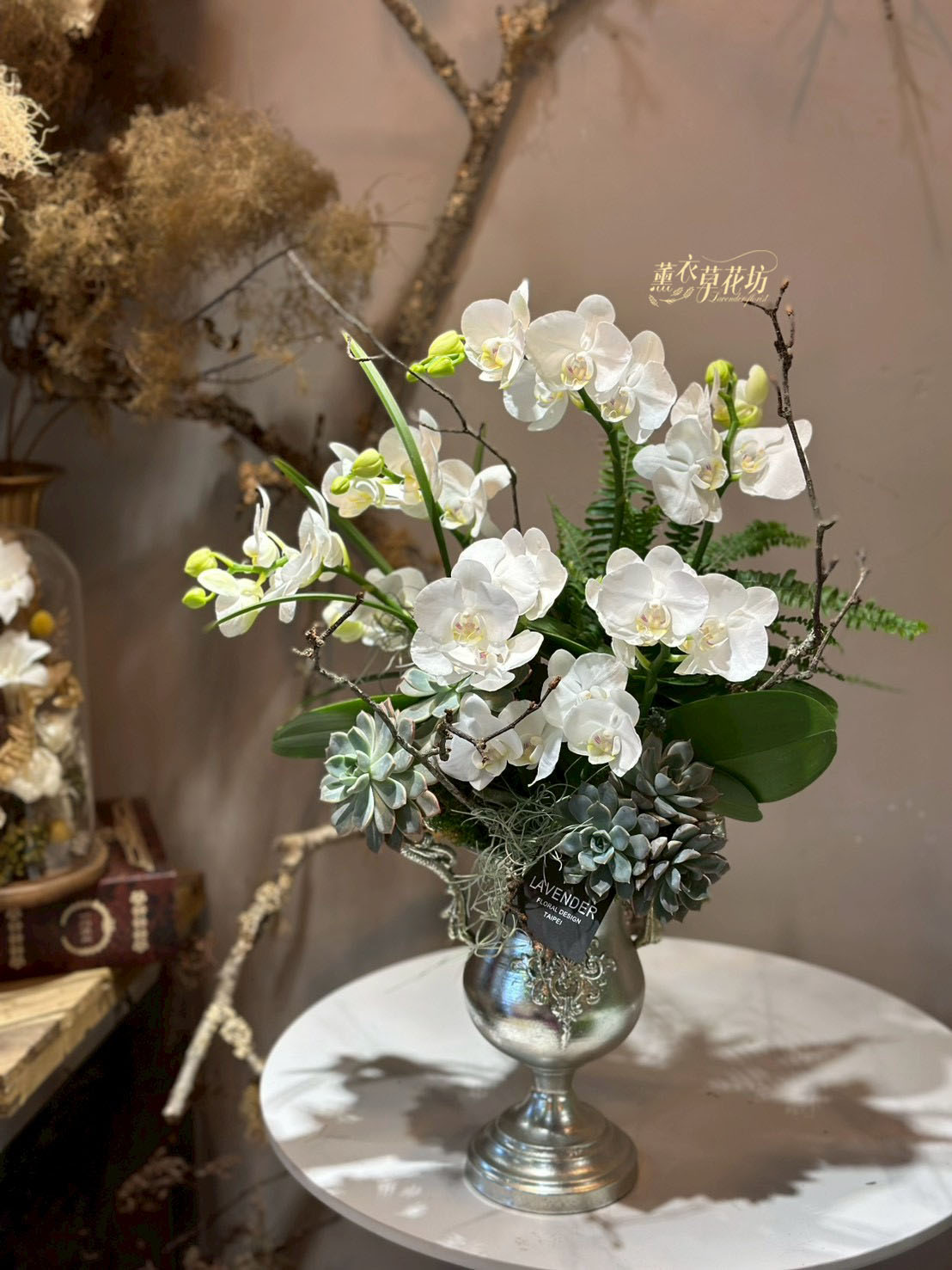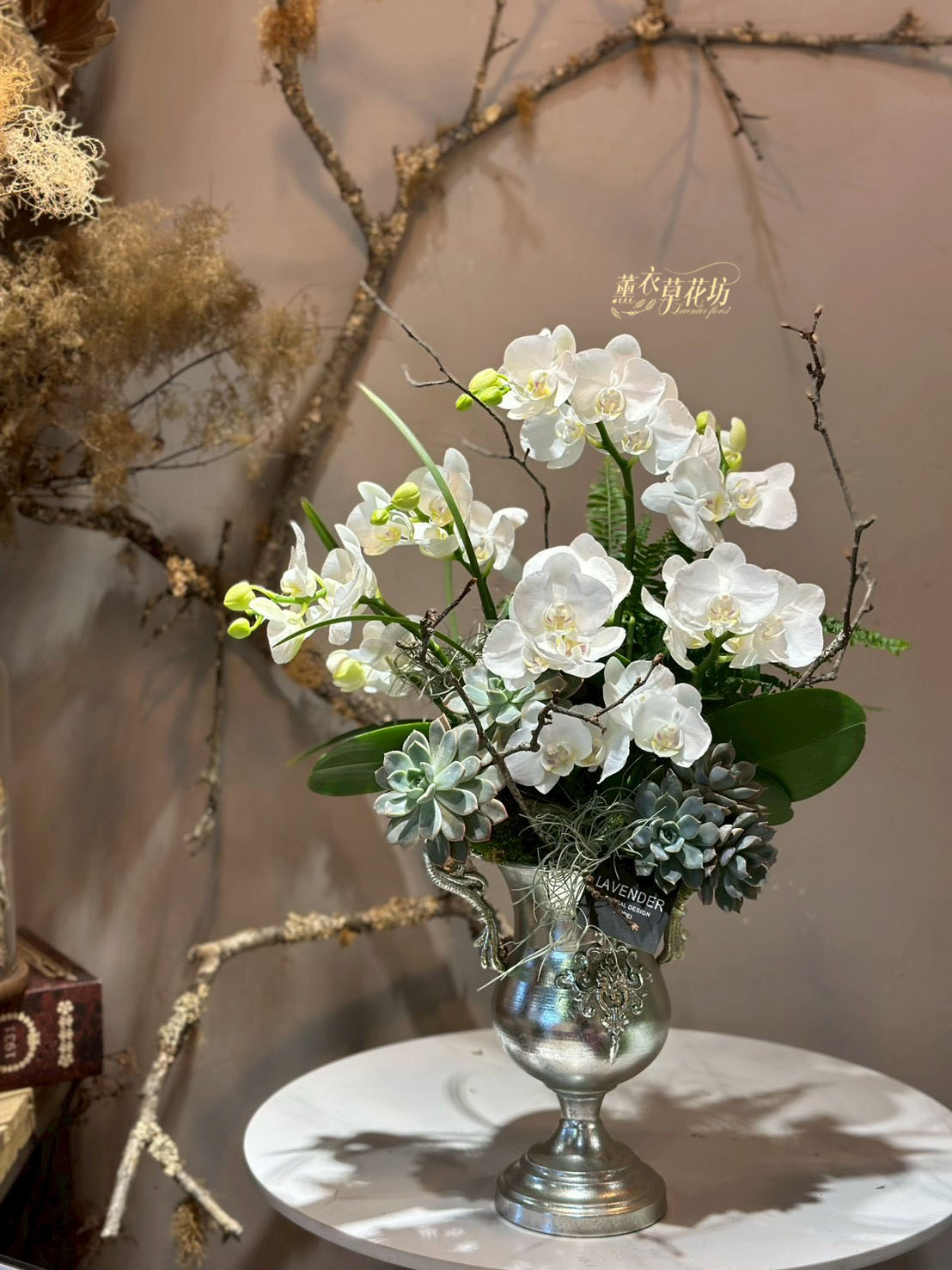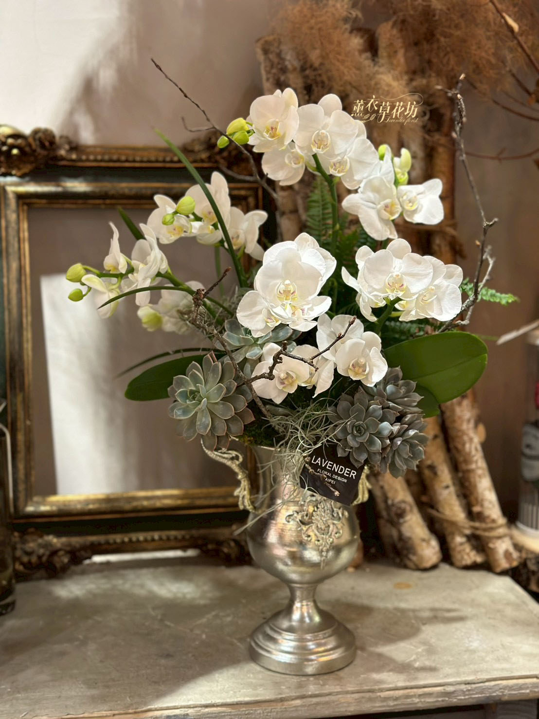 【品名】迷你蝴蝶蘭(當季類似款美一盆做出來都無法一模一樣唷)&多肉植物/復古盆器~可以更改色系唷.請在備註欄註記.