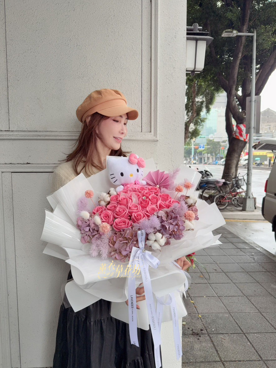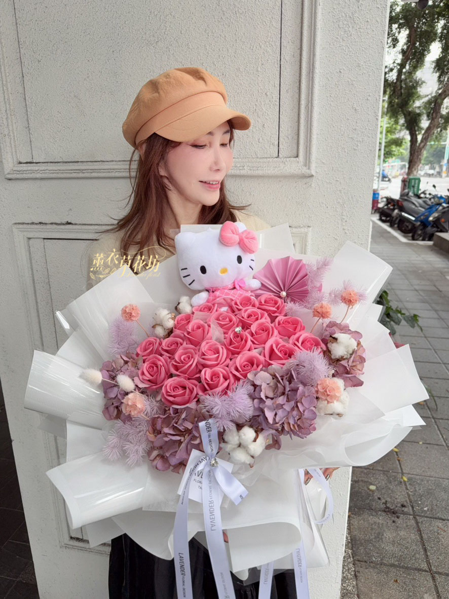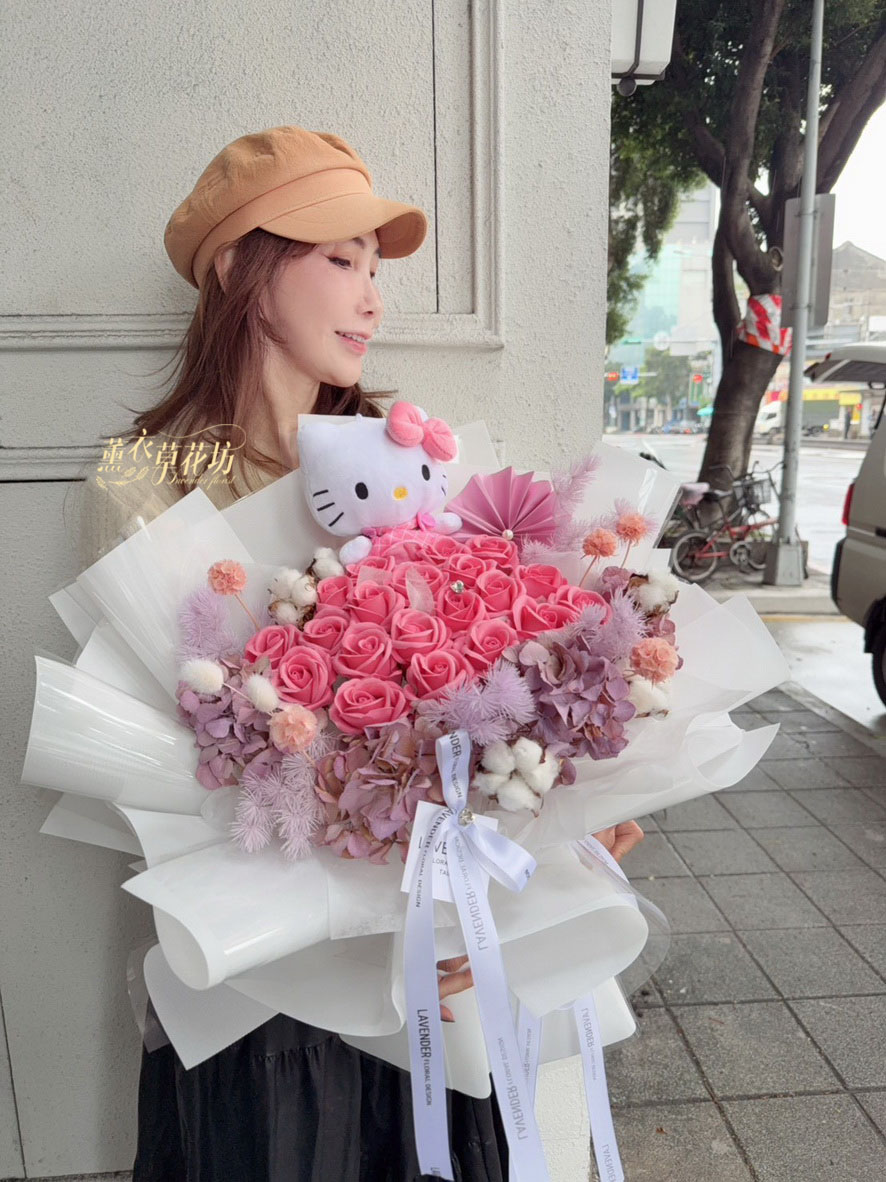 【品名】凱蒂貓&20朵香皂玫瑰&乾燥花材設計