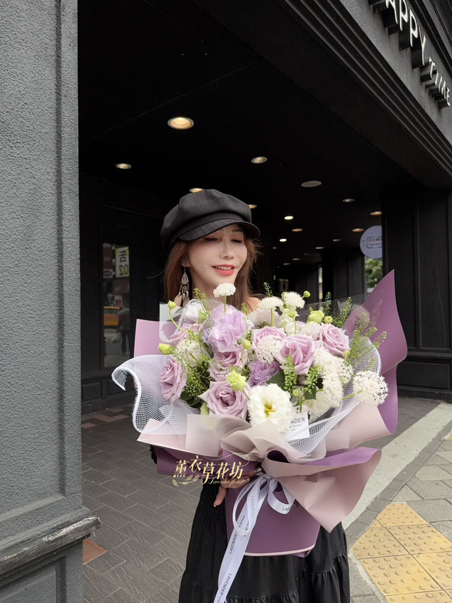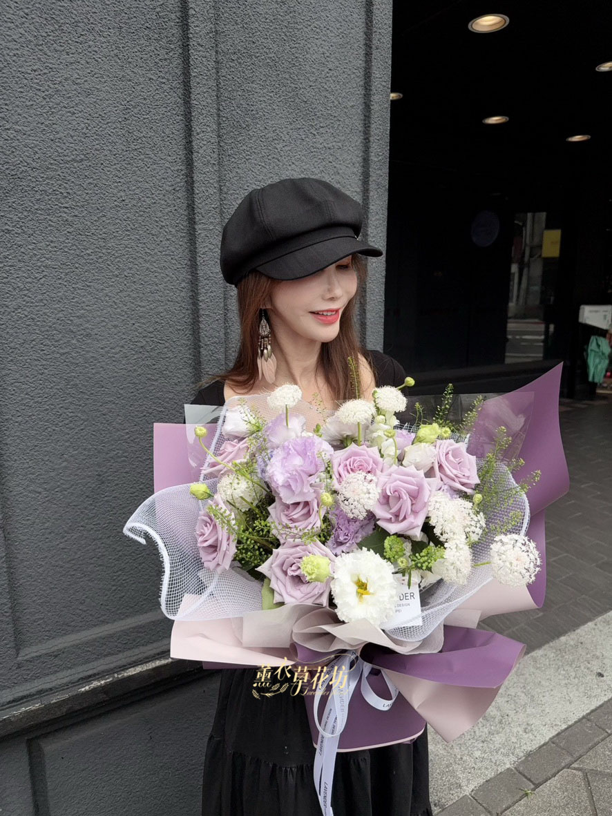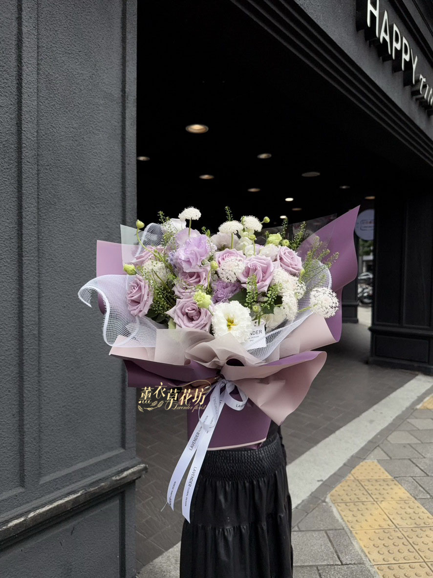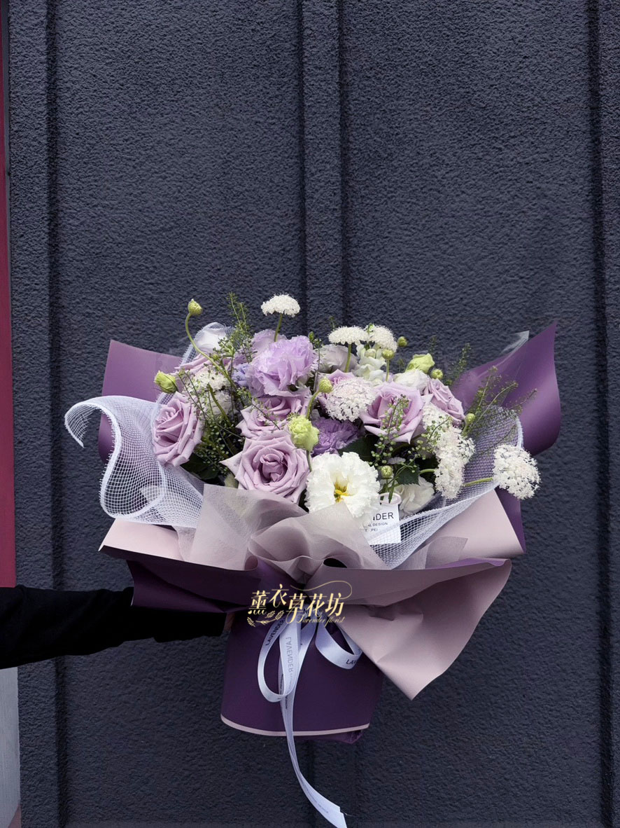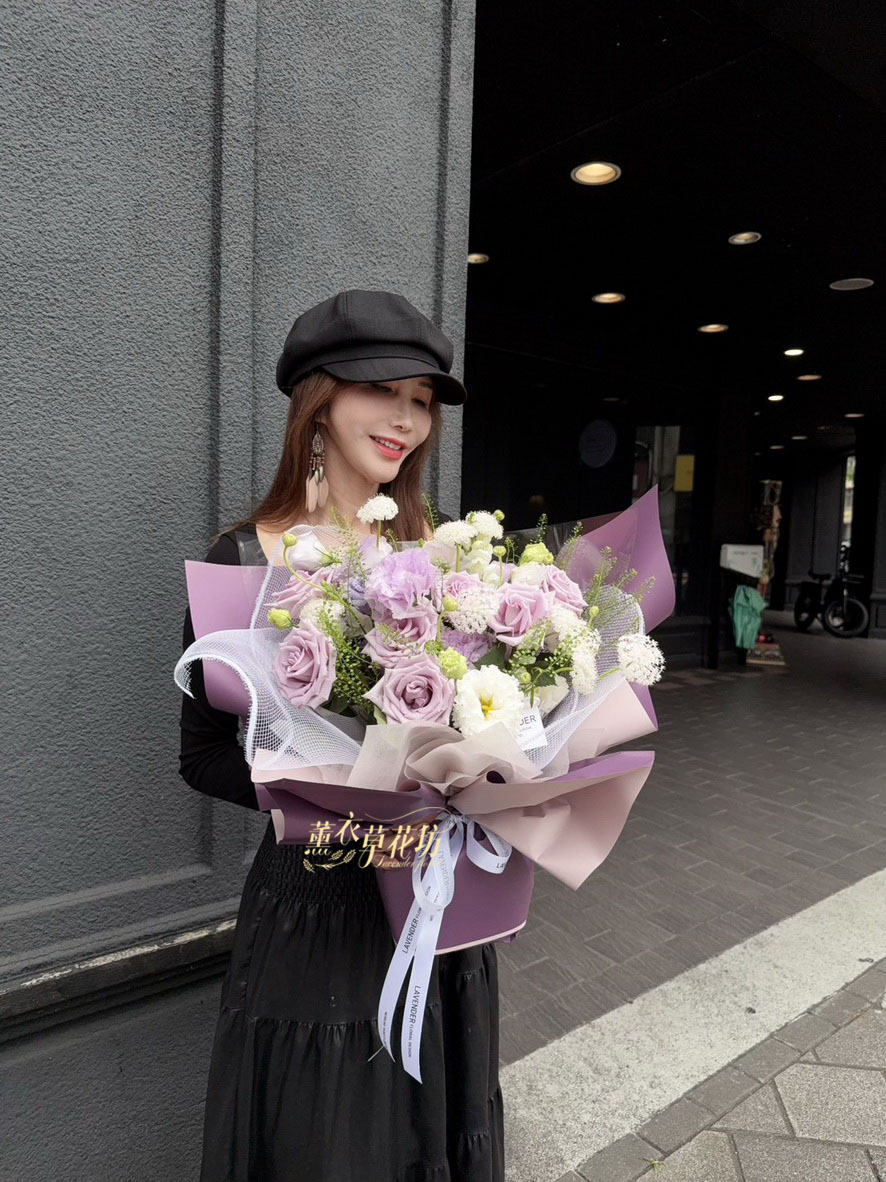 【品名】進口~7朵~紫色玫瑰/桔梗/當季配花~花束.設計師搭配類似唷.請預購喔