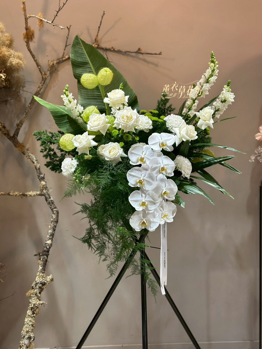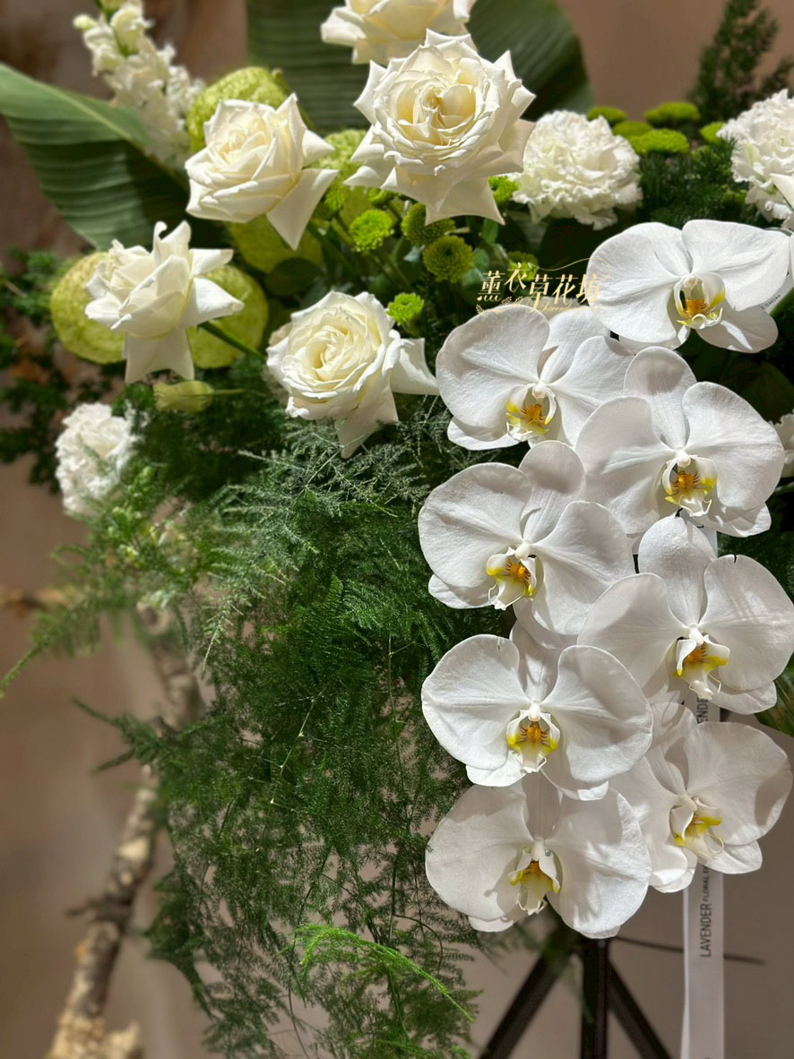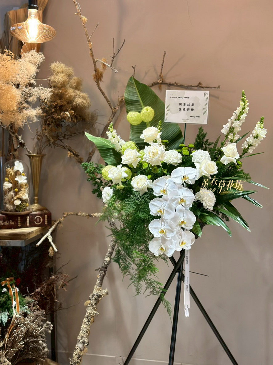 【規格】主花材~白色蝴蝶蘭/玫瑰/小菊花/當季花材