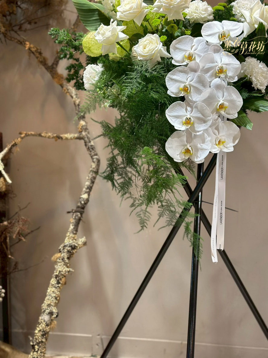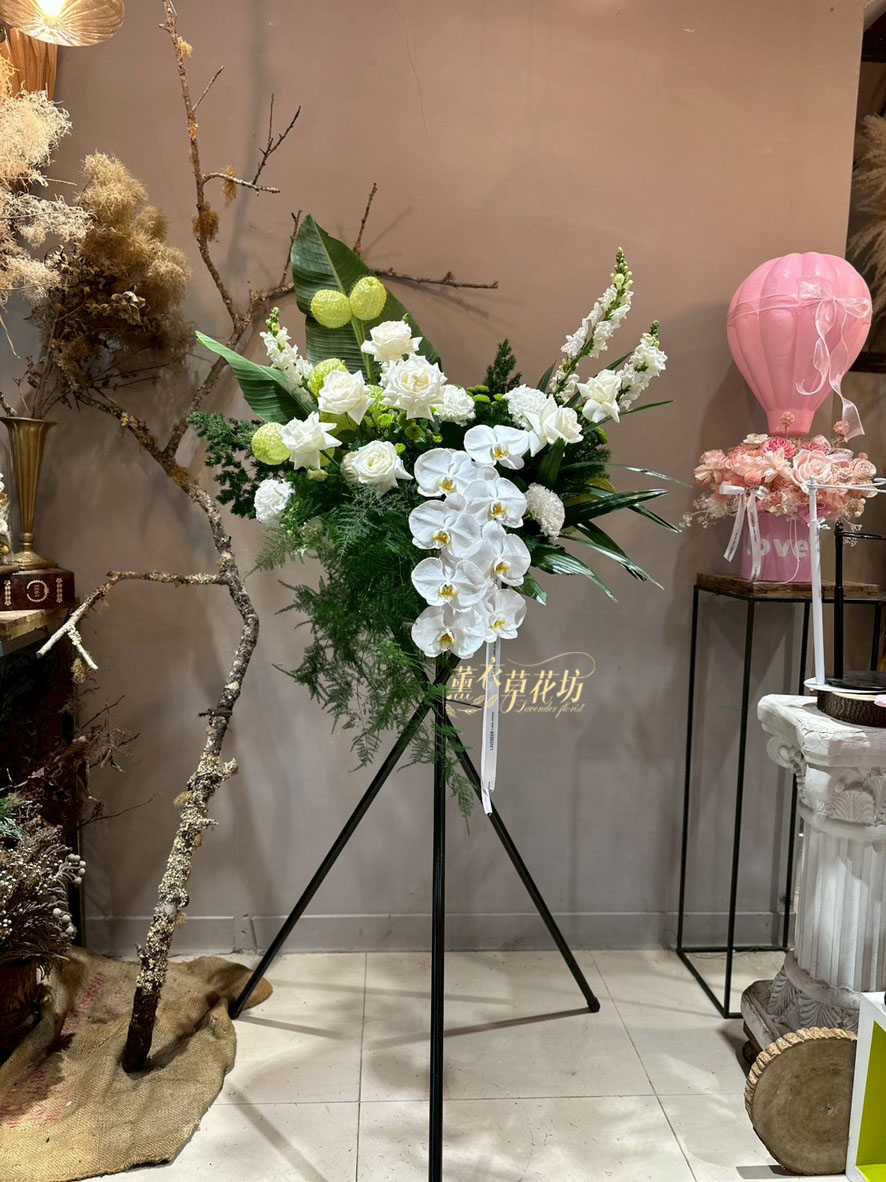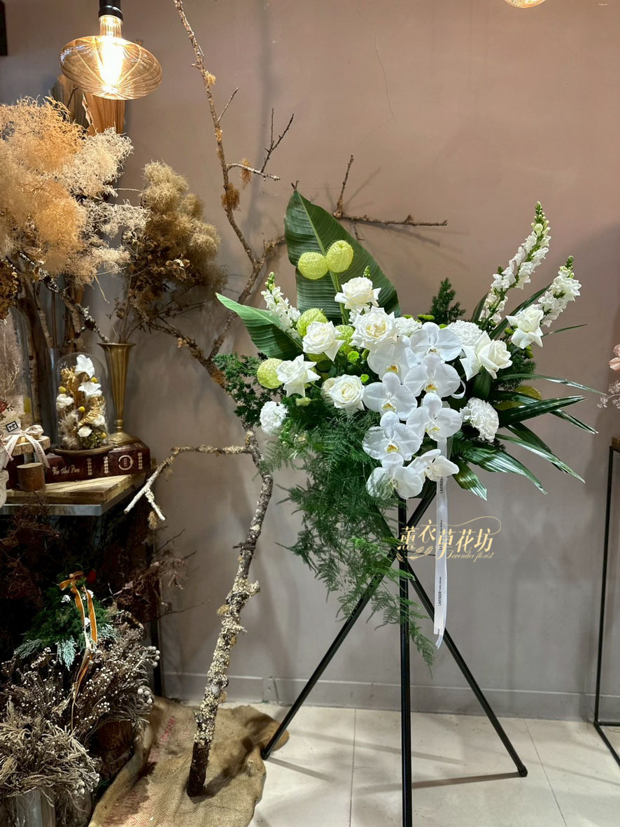 【規格】主花材~白色蝴蝶蘭/玫瑰/小菊花/當季花材